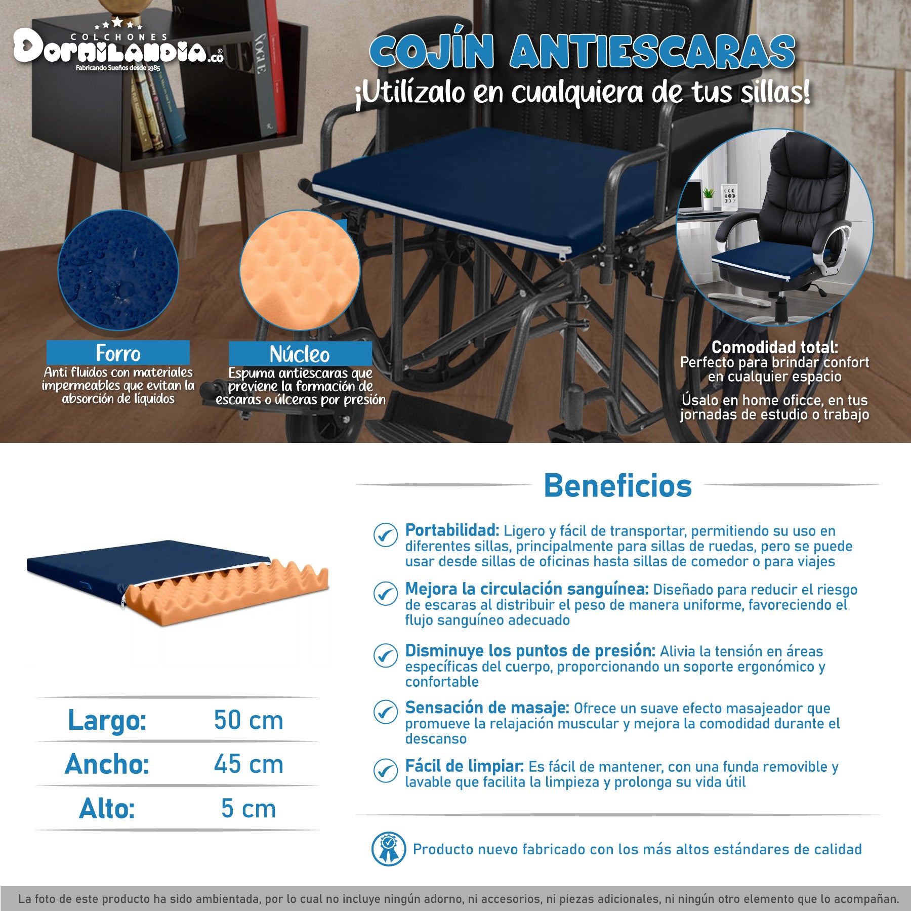 Dormilandia trae para ti nuestro Cojín Antiescaras con forro antifluidos, puedes usarla principalmente para sillas de ruedas, también en cualquier silla de comedor, sala, oficina o ¡en donde quieras!