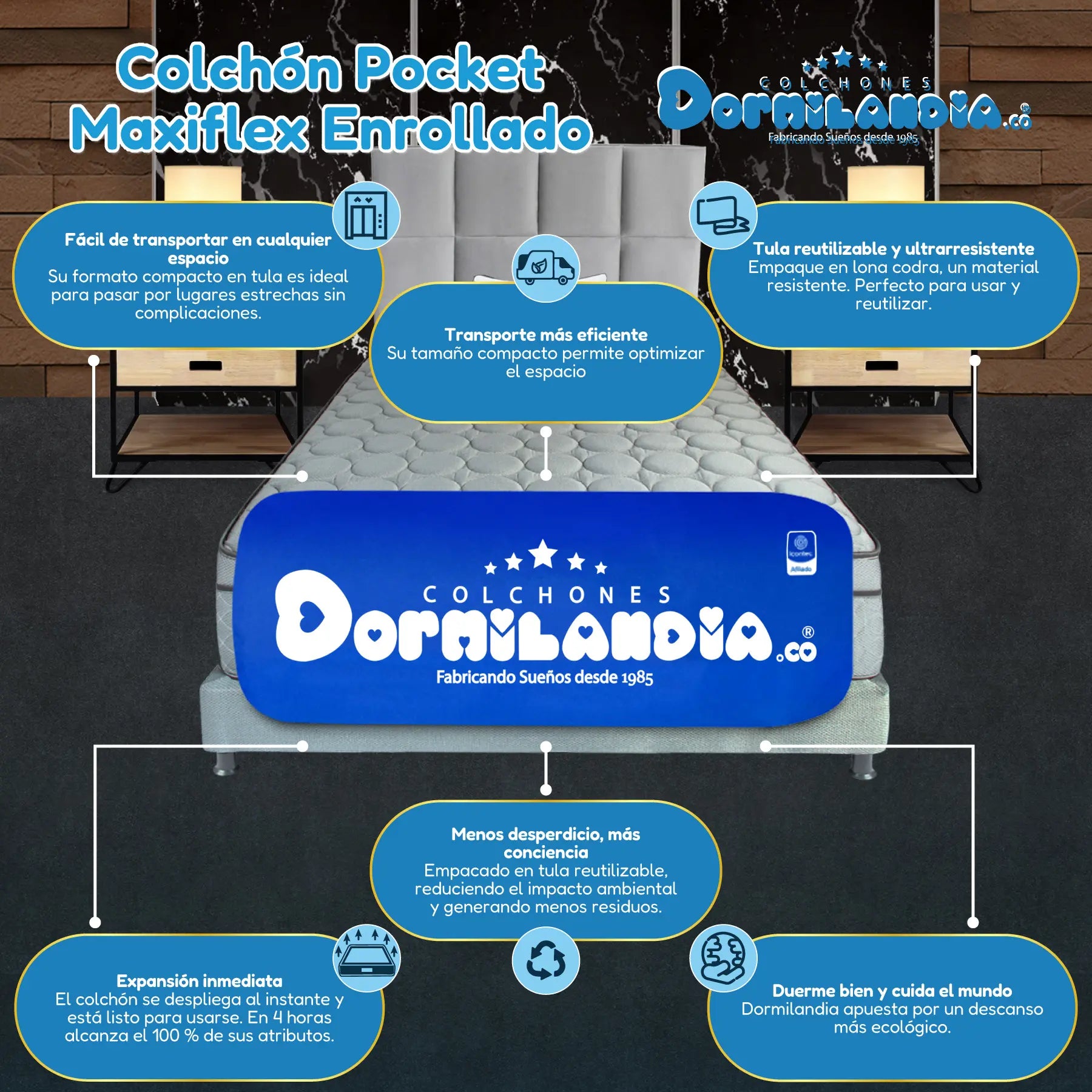 Mega Combo Colchón Pocket Maxiflex Enrollado En Tula Confortable + Base Cama + Cabecero + Almohadas