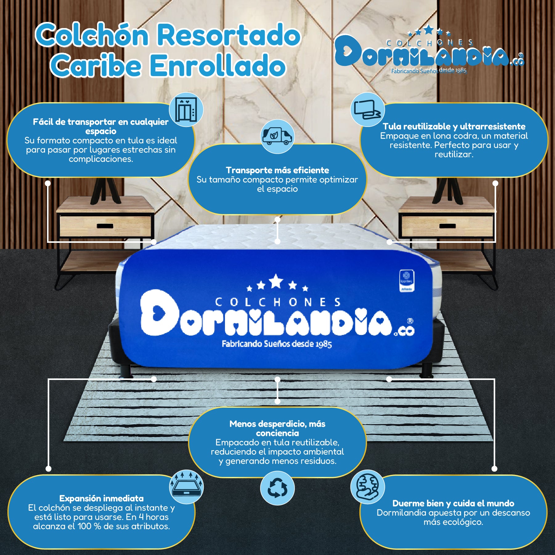 Mega Combo Colchón Caribe Resortado Enrollado + Base Cama+ Cabecero +Almohadas