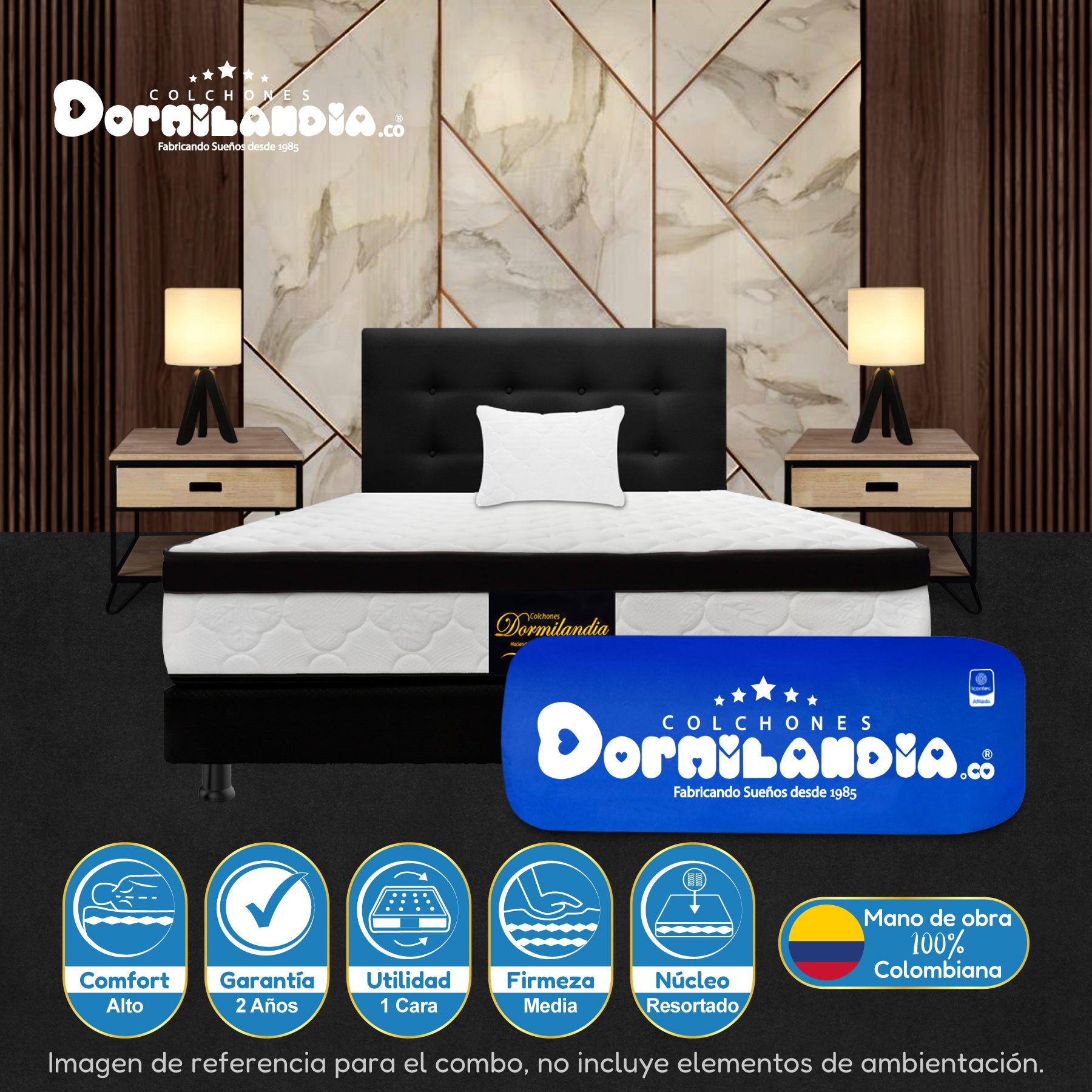 Mega Combo Colchón Resortado Versalles Enrollado En Tula Confortable + Base Cama + Cabecero + Almohadas