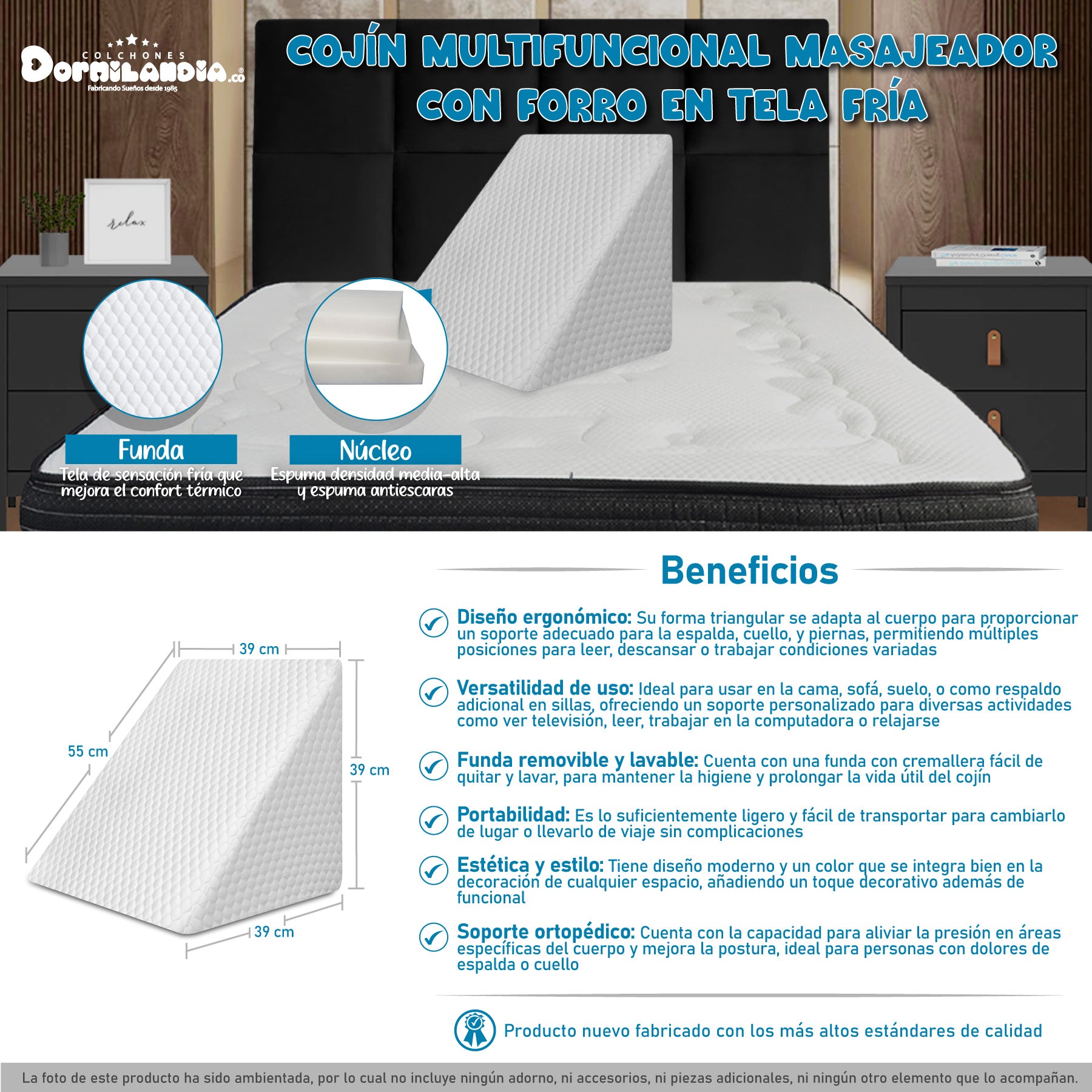 Dormilandia trae para ti el cojín multifuncional confortable en tela sensación fría. Ideal para ver televisión, leer, disfrutar de tus series favoritas y realizar distintas actividades de una forma mas confortable, fresca y agradable. Su forma triangular permite una mejor postura al momento de realizar tus actividades preferidas.